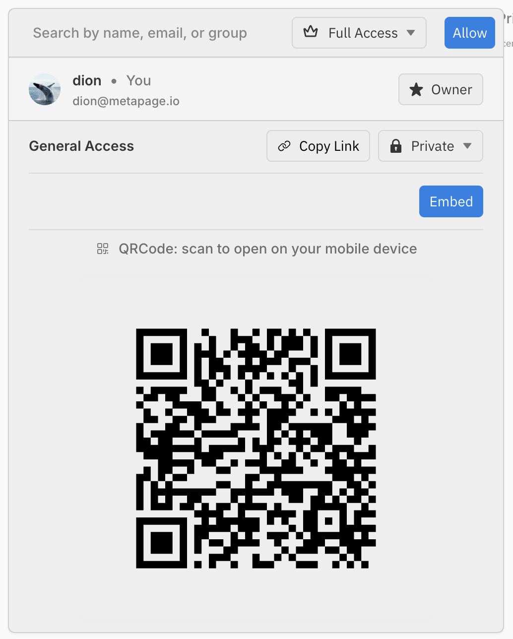 You can get the QR code of any metapage via the share menu. Copy the image into your poster, your presentation, your website, now anyone can immediately view and interact with your data, your visualization, right there and then. Also just show someone the QR Code via your phone: now you are communicating directly in models, simulations, and workflows.
