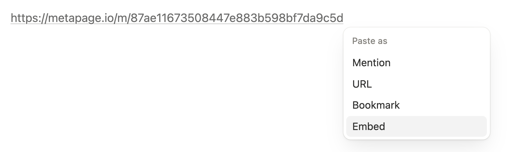 Metapages work out of the box with Notion. Paste the URL and choose “Embed”: